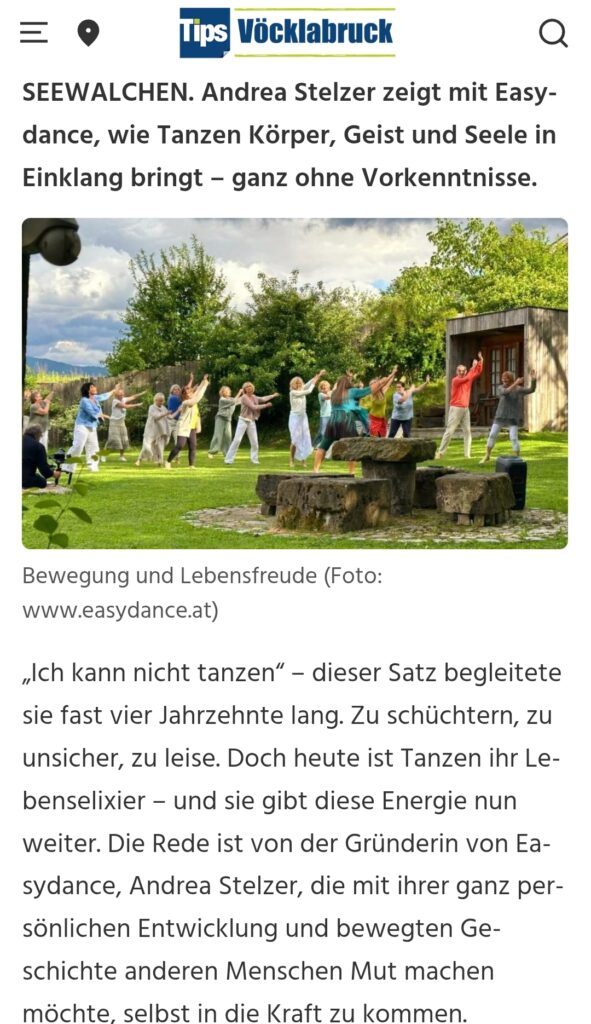 Easydance-Kurse findest Du unter Termine hier auf dieser Homepage. Mittlerweile in Linz Freistadt, Aigen-Schlägl, Bad Wimsbach-Neydharting, Steyr, Kirchdorf an der Krems und Salzburg. Sichere Dir rechtzeitig deinen wöchentlichen Easydance-Kurs!